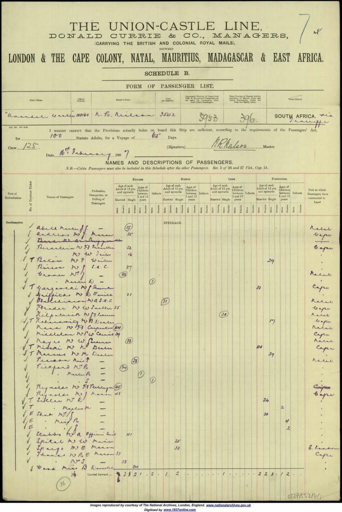 He married in Nellie Tippet on the 8th October 1900 and sailed on the 3rd December on the Avondale Castle, from South Africa to East London in South Africa.