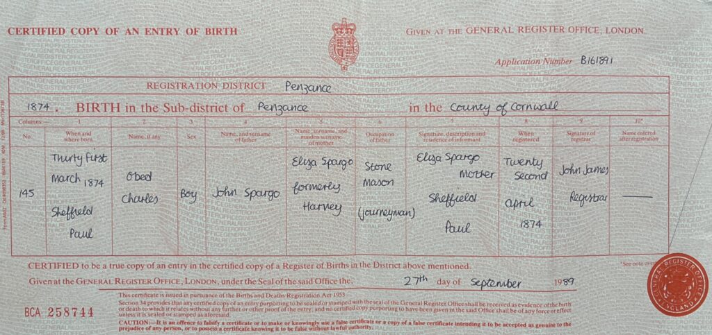 Obed was born on the 31st March 1874 in Paul. He was registered as Obed Charles., but his parents must have had second thoughts and he was baptised as Obed Thomas on the 5th July.. he was the third child of nine.