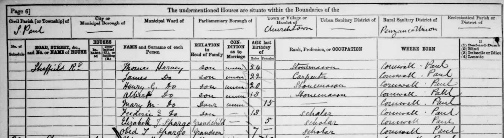 The Spargo household must have been quite crowded and here in the 1881 Census we find Obed and his sister Elizabeth either having a sleepover or living with the maternal grandparents.