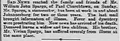 Obed Thomas Spargo and Nellie Tippet married on the 8th October 1900 in Paul Church. Obed sailed to South Africa on the 3rd December, two months after the wedding.