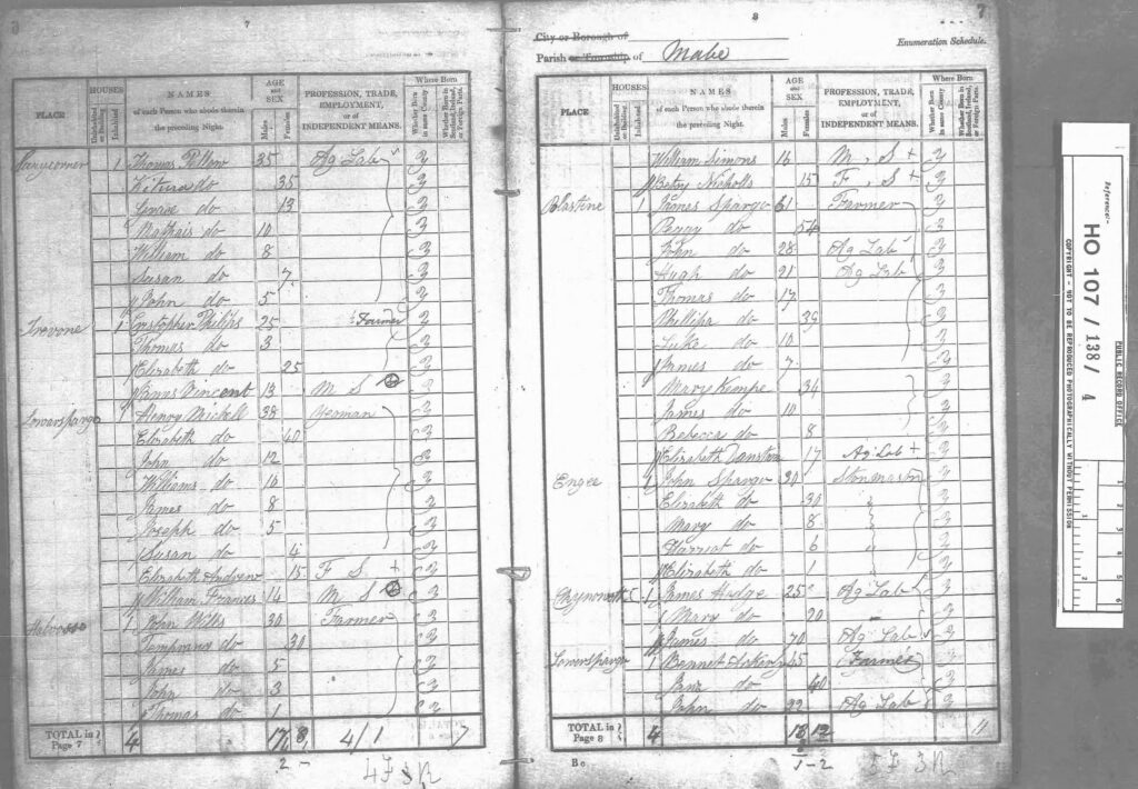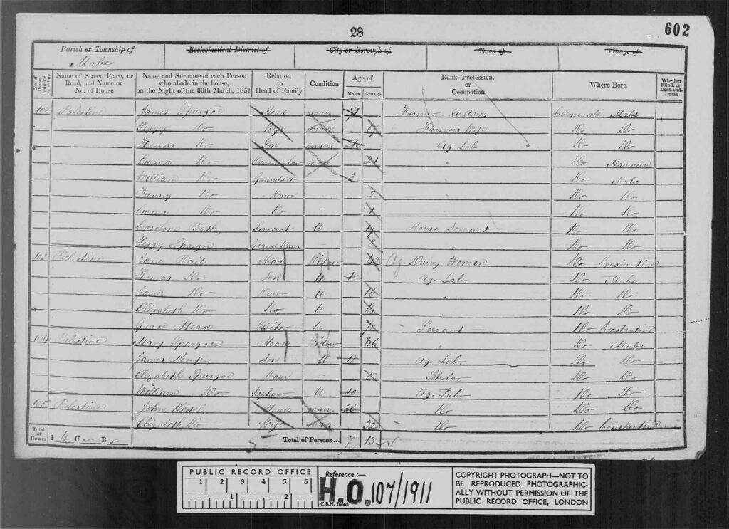 After James’s death we do not know if his son Thomas took over the farm at Palestine and the other properties listed in the Will. The 1861 Census covering Mabe in the National Archives does not seem to include Palestine. More investigation needed.