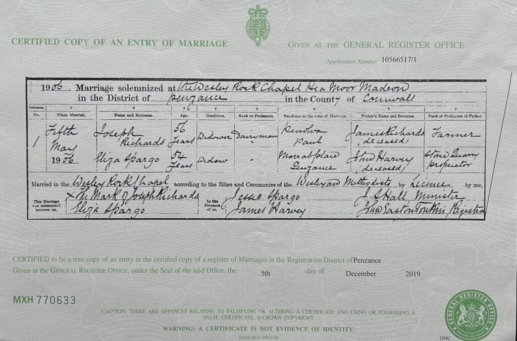 So sad to find that he was buried in Bodmin, presumably in a pauper’s grave. The funeral fund payout did not stretch it would seem to bringing him back to Paul. Perhaps the money was used to support the family.