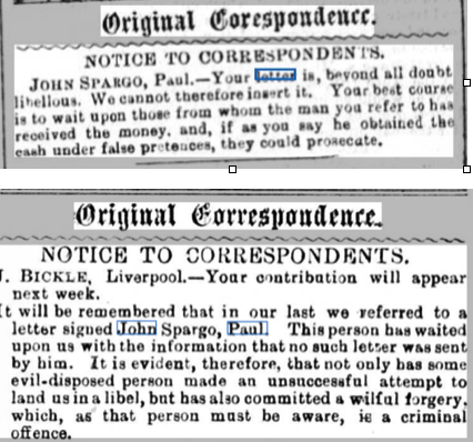 The Cornish Telegraph letters sections had 2 entries relating to John Spargo, dated 5.2.1885 and 12.2.1885