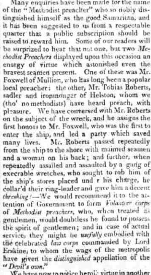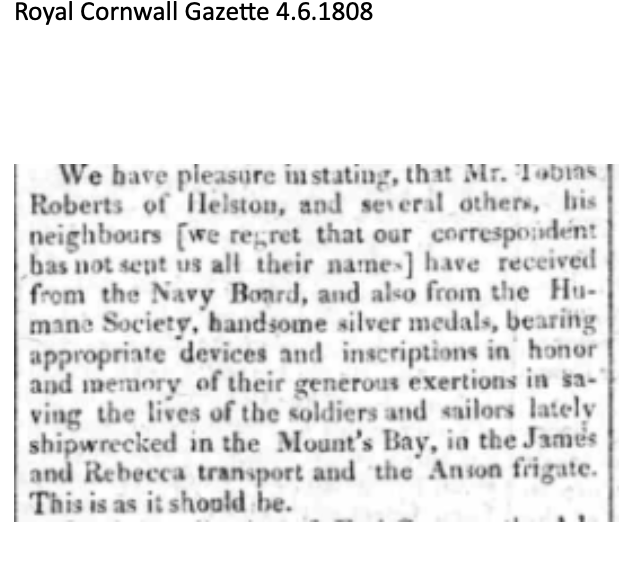 In December 1807 a navy frigate the Anson was shipwrecked off Loe Bar and over a hundred people were drowned. William and several others were part of a rescue operation.